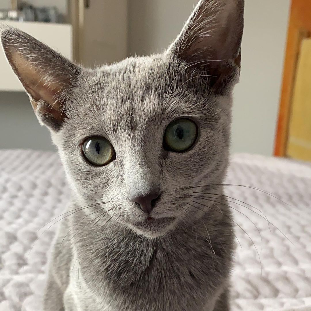 One of the most interesting aspects of Russian blues’ appearances is their eyes, which change in hue from yellow to green over time. Russian blue kittens are born with light yellow or golden eyes, which turn to yellow with a green ring around four months old, and finally, turn fully bright green in adulthood.