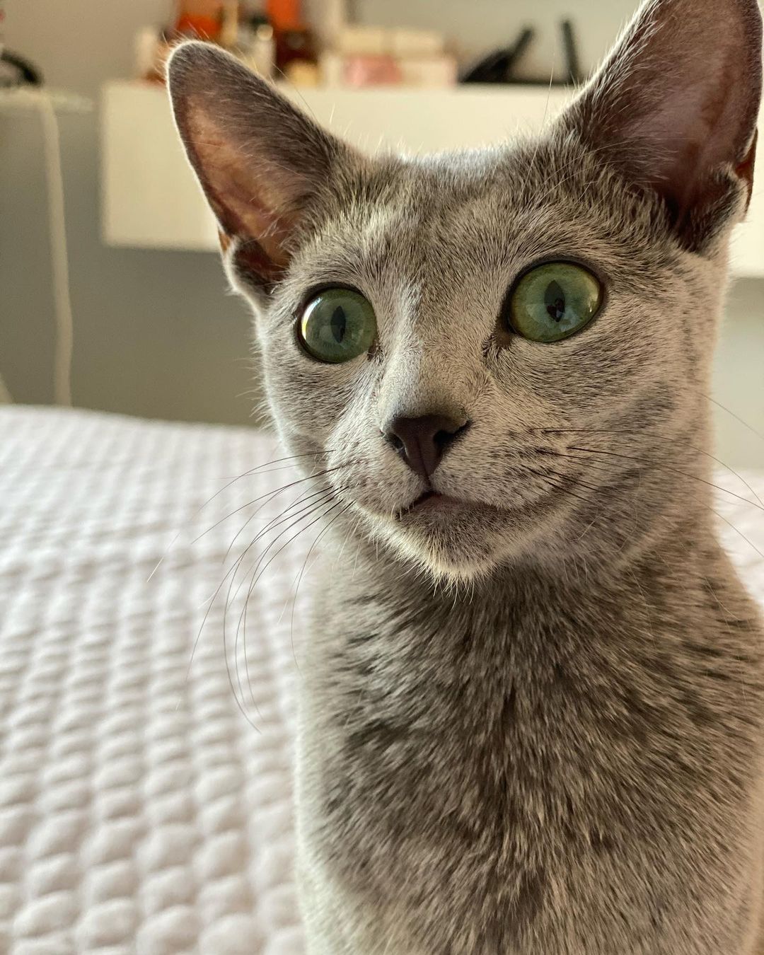 Russian blues are known for their thick, gorgeous blue-gray coat and bright eyes. These cats are sweet, loyal, and cautious animals who love having a routine.